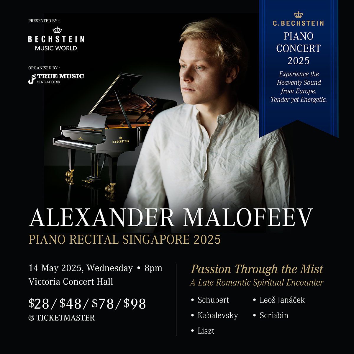 In Janáček’s In the Mists, we are drawn into a world of unresolved emotions—its shifting tonalities and haunting lyricism reflecting the composer’s inner turmoil. The recital culminates in the mystical landscapes of Scriabin’s Préludes, Op. 22, and Fantaisie, Op. 28.; works that push beyond Romanticism into spiritual ecstasy. Through this program, Malofeev channels both fire and fragility, illuminating the endurance of the human spirit through music.