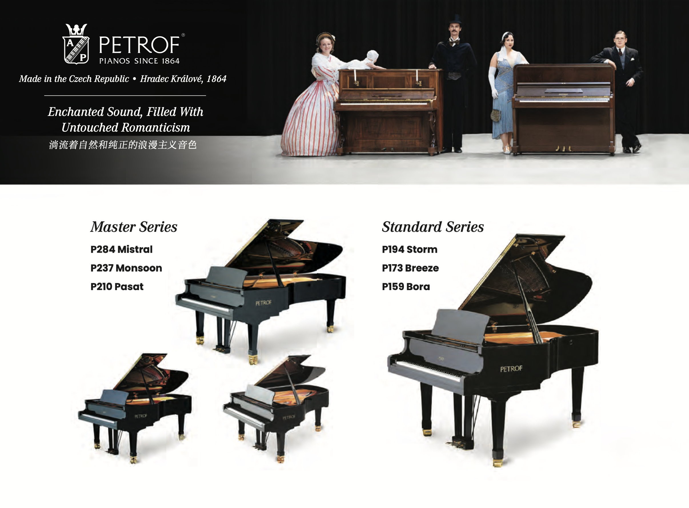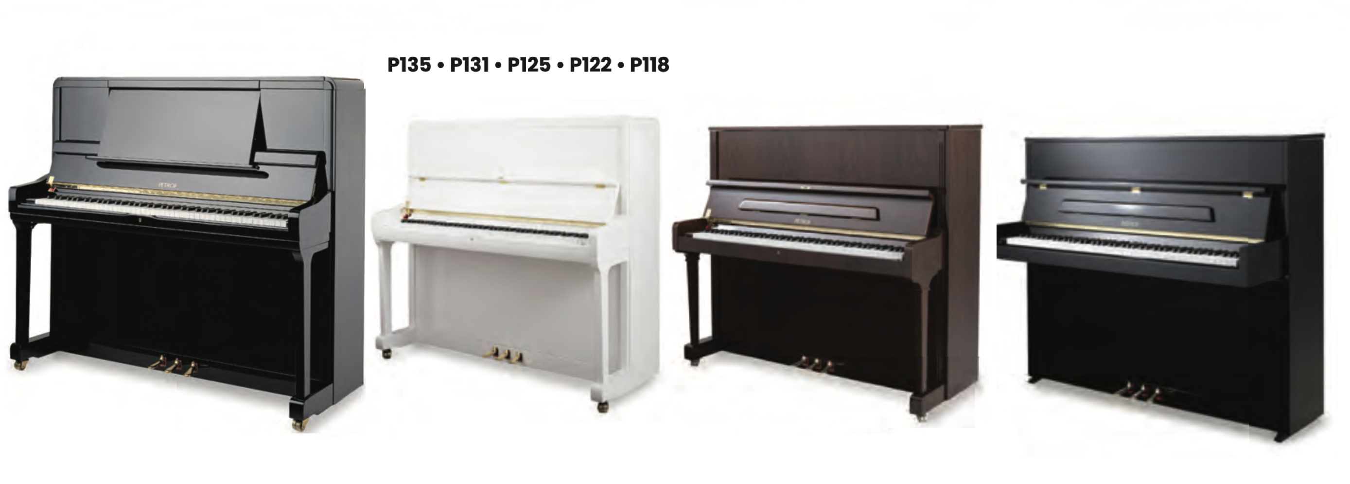 PETROF : The largest piano maker in the Czech Republic and one of the oldest in the world. With the head office, R&D, and production plant firmly rooted in the company’s hometown of Hradec Králové, PETROF currently manufactures their grand piano models, ranging from the standard Bora, Breeze, and Storm to the top-of-the-line Pasat, Monsoon, and Mistral, along with a premier lineup of upright piano models.
