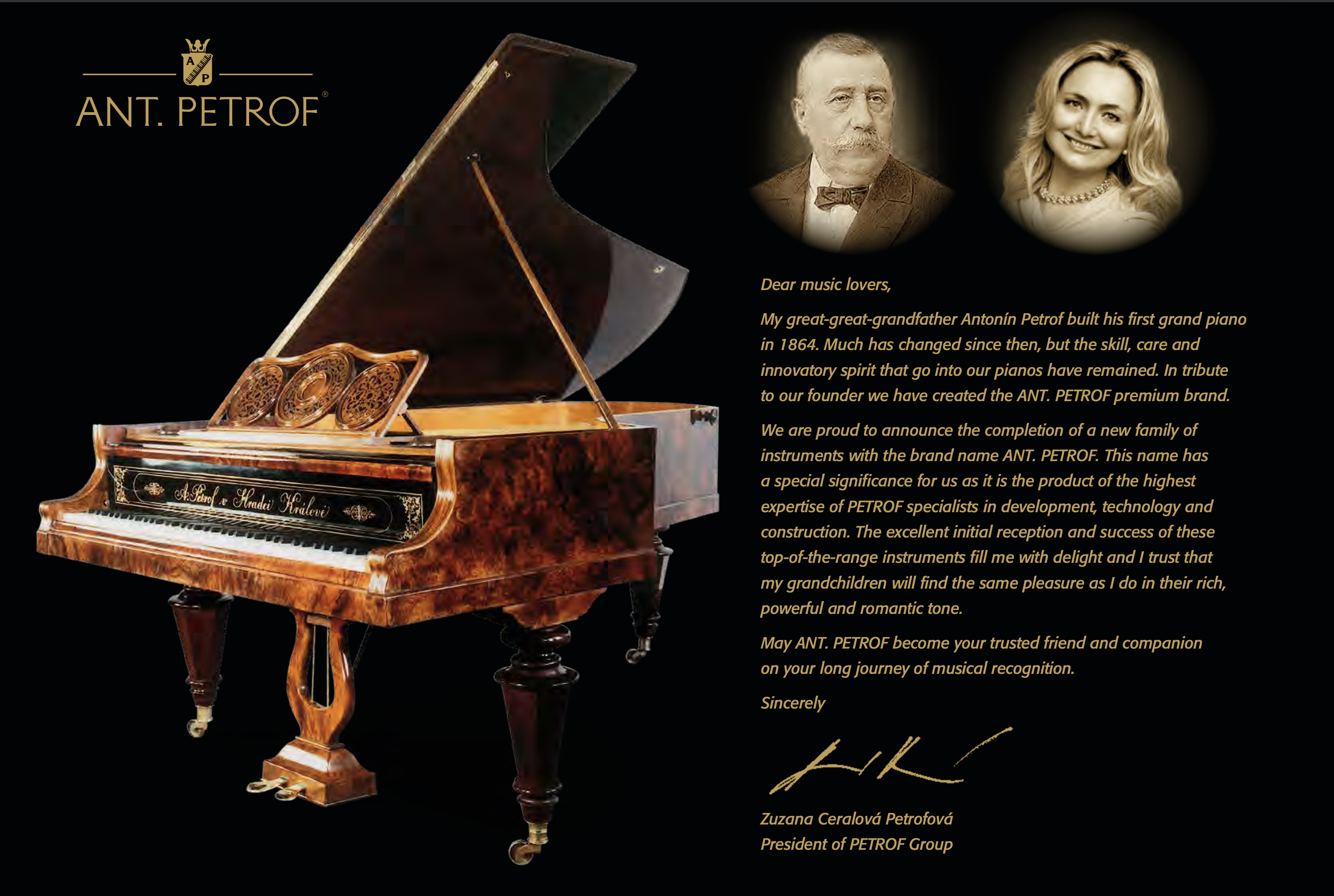 ANT. PETROF : Petrof’s most preeminent signature line and a tribute to the Petrof brand founder Antonín Petrof. A wealth of modern equipment combined with 160 years of Czech piano-making tradition. The 3 most majestic models of ANT. PETROF pianos, built with premium quality materials and meticulous hand-craftsmanship, have made their way to the homes and the world’s most prestigious concert halls.